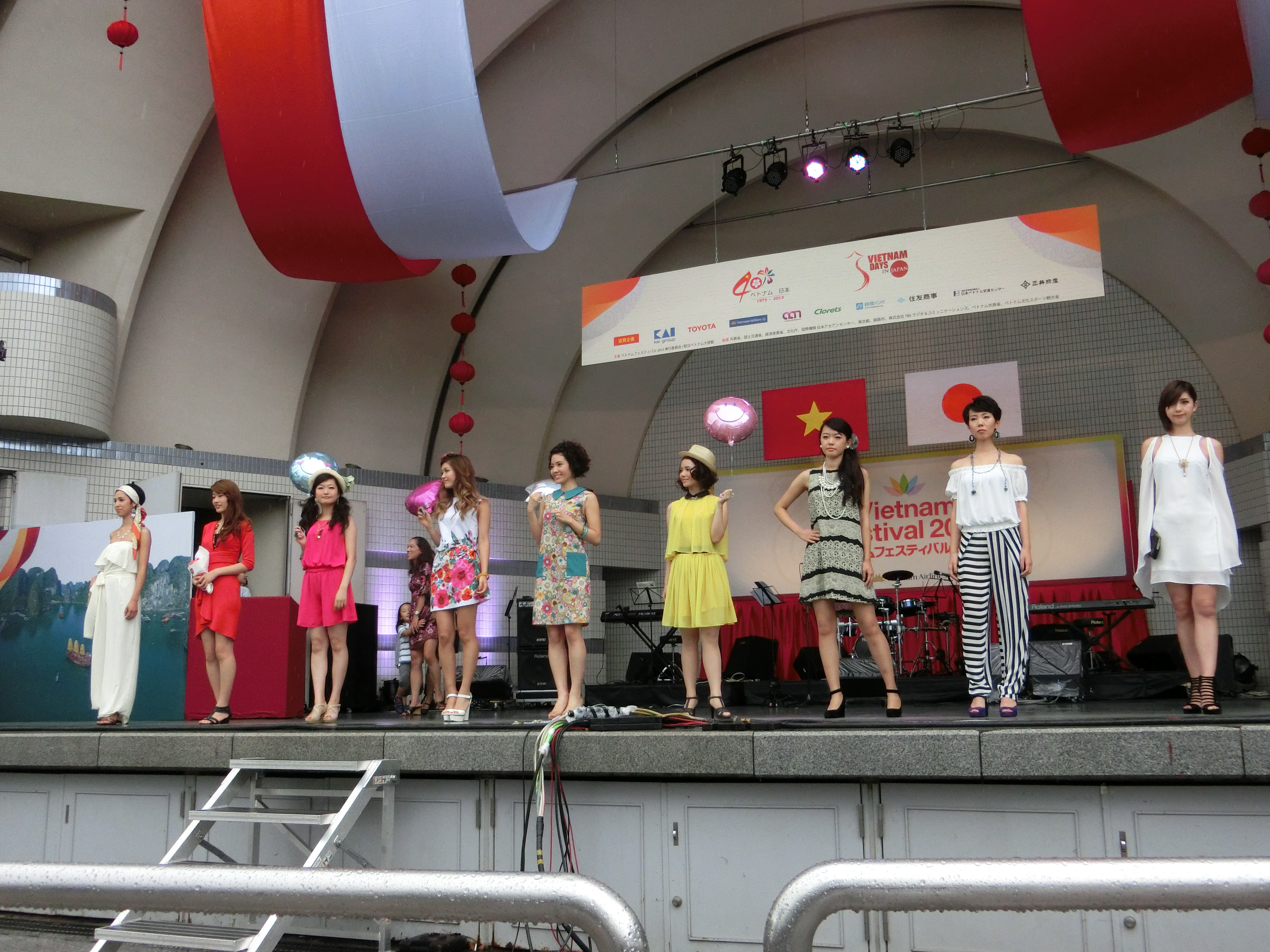 フォーラムと協力、ベトナムフェスティバルのステージでファッションショー開催しました。朝から激しい雨が続いていたが、出番が近づくうちに徐々に雨がおさまってきました。そして無事に本番を迎えることができました。花王の方々にヘアメイクアップをしてもらい、ベトナムの有名なUMBRELLAの衣装を着て、素敵な音楽に合わせて歩くモデルのみんなとても可愛らしく、美しくて大成功ショーできました。 詳細はファッションショーのフェスブックページhttps://www.facebook.com/SquareOfMにご参照!
